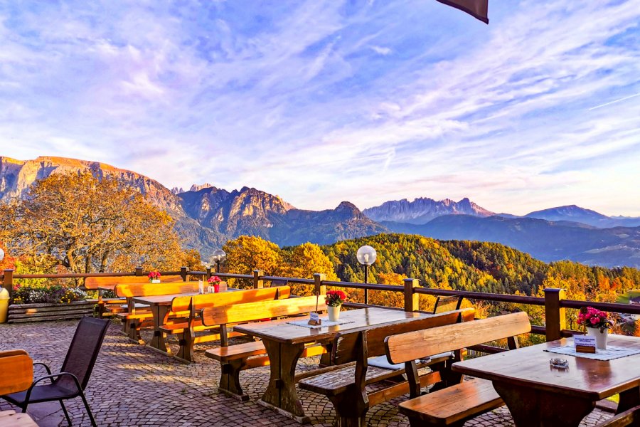 Die große Terrasse mit einem unvergesslichen Ausblick auf den Schlern und die Dolomiten lädt an warmen Sommertagen zum Verweilen ein; die Liegewiese sowie der Streichelzoo für die kleinen Besucher runden einen Besuch bei uns in Oberlengmoos ab.